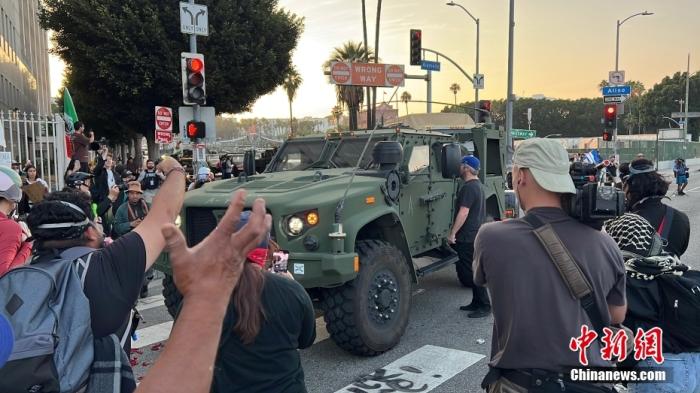 当地时间6月10日,美国加利福尼亚州洛杉矶市中心的反搜捕非法移民行动抗议示威仍在持续,情绪激动的抗议者围堵军车。